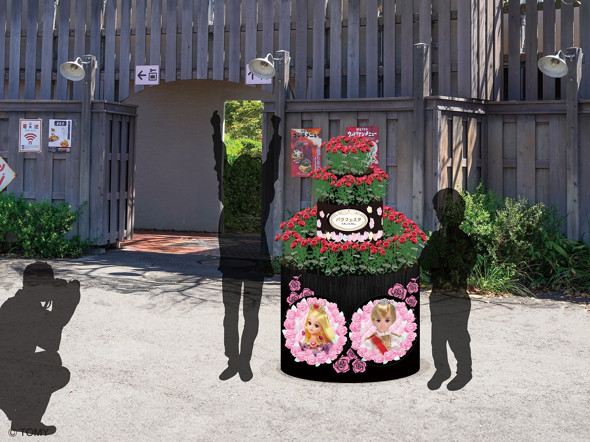 エントランスエリアでは、リカちゃんの好きな赤いバラの美しさが目を引く、華やかで印象的な景観のバラタワーが登場します。土台はリカちゃんの装飾で彩られ、非日常感溢れる今だけの特別なフォトスポットをお楽しみいただけます。