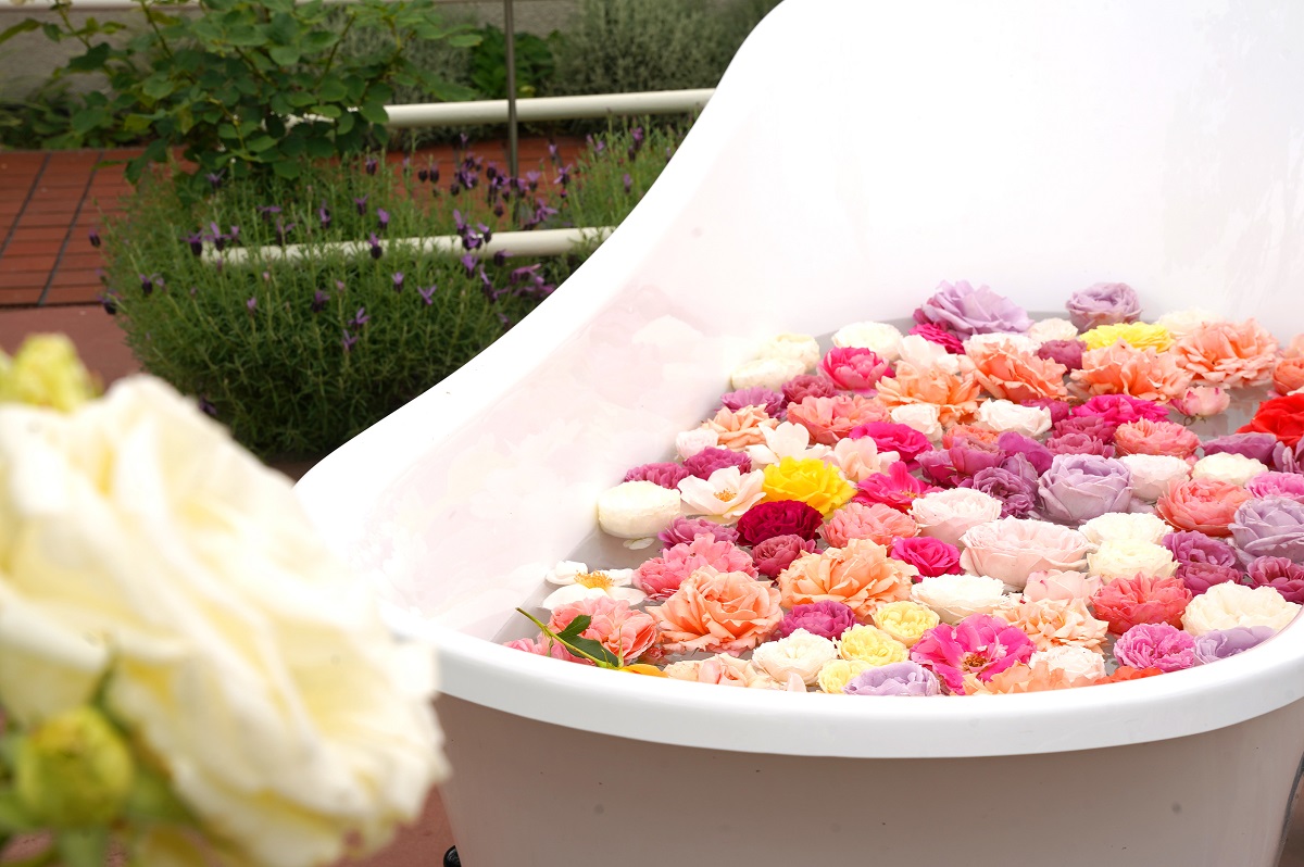 西武園ゆうえんちに咲くバラを浮かべた2つの花手水をバラエン内に設置いたします。