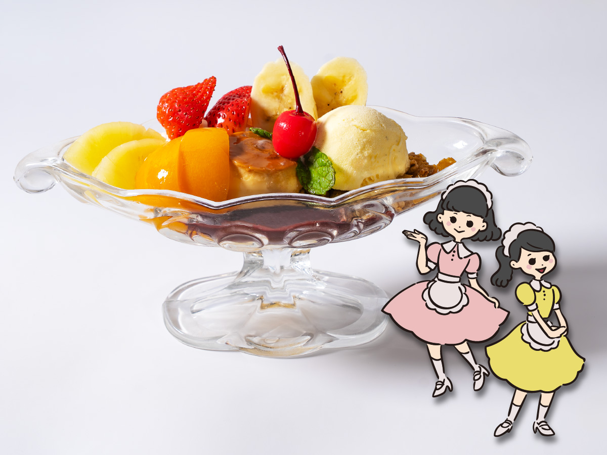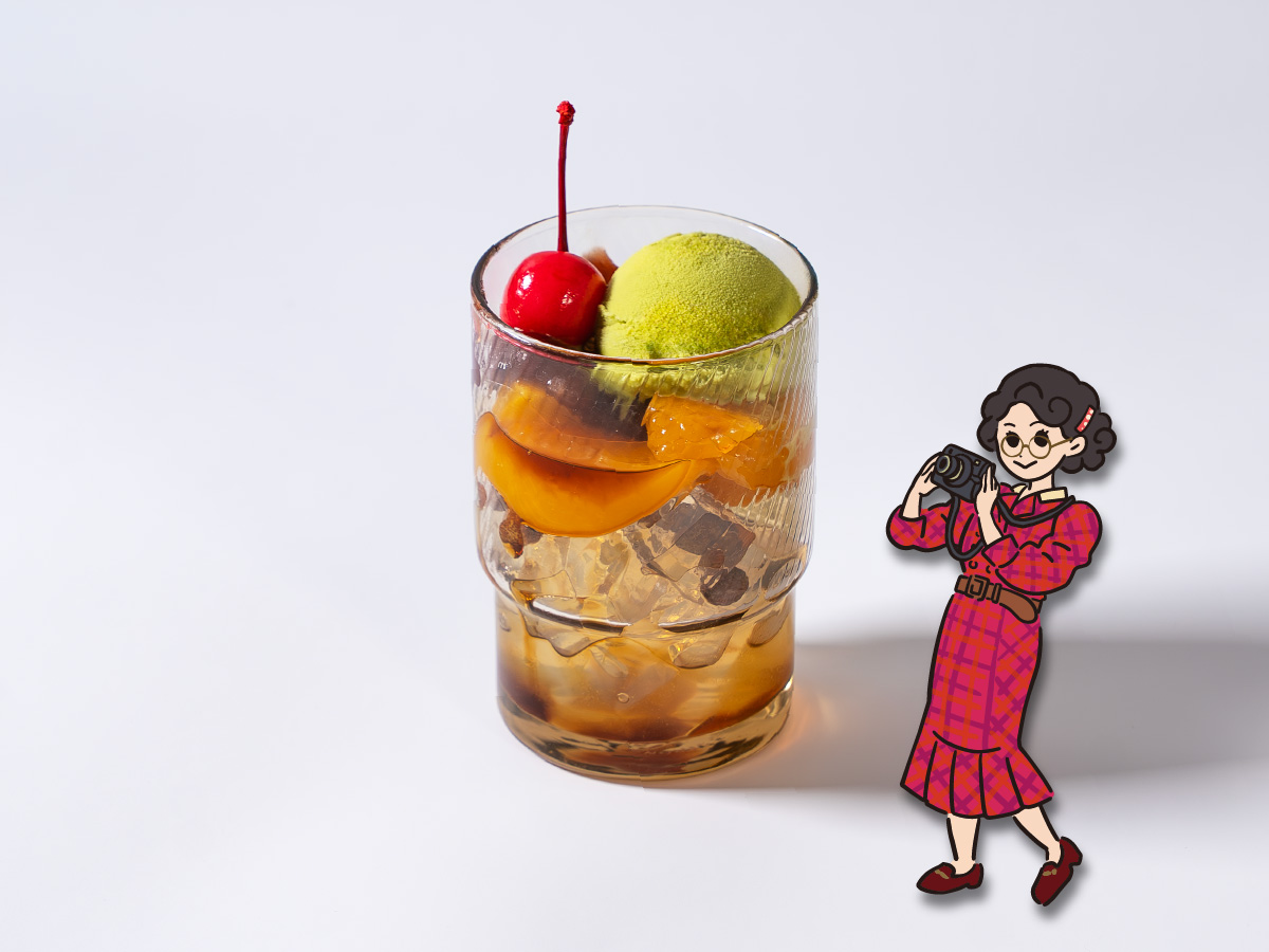 ツヤツヤな寒天を『つや子』に掛け、赤いさくらんぼが寫眞舘・つや子の髪飾りをイメージした一品です。